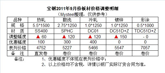 表一:2011年9月寶鋼主流板材品種價(jià)格調(diào)整明細(xì)
