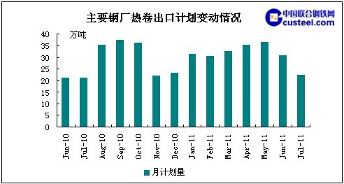 從目前國內(nèi)外發(fā)展形勢來看,7-8月份出口市場仍不太看好,預(yù)計鋼材出口形勢好轉(zhuǎn)將有可能在三季度末也就是9月份以后體現(xiàn)。以熱卷為例,本網(wǎng)調(diào)查結(jié)果顯示,17家主流熱卷鋼廠7月計劃出口量為22.3萬噸,與上月相比減少了8.3萬噸,環(huán)比下降了27.1%,降幅比上月擴(kuò)大10.9個百分點。
